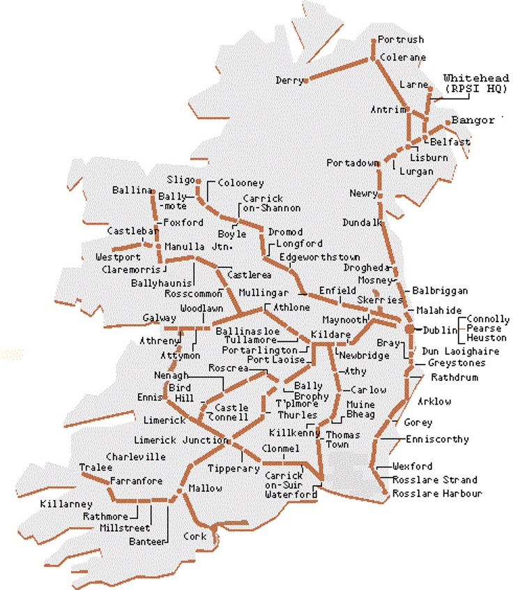 - Iarnród Eireann / Irish Rail. IE operate the Belfast line as above, jointly with Translink, but as well as that have longer-distance services operating from Dublin to main centres in the west and south. Going clockwise, starting due south of Dublin, you can get trains to Wexford & Rosslare; Kilkenny & Waterford; Cork, Killarney and Tralee; Limerick and Ennis; Athlone, Galway, Westport & Ballina, and Mullingar and Sligo up in the northwest. Sligo is the railhead for places like Co. Donegal, but you need to get buses north of Sligo, or better still, direct buses from Dublin to Donegal town or Letterkenny. Service frequencies to Cork are hourly, Galway and Sligo almost hourly, and other lines have between 4 and 6 trains a day. In terms of time taken, the longest journeys are from Dublin to Tralee (south-west) or Westport (west); each of these journeys take something over four hours. There are also cross-country train services from Galway to Limerick, and (albeit exceptionally slow and with poor connections) twice a day between Limerick Junction and Waterford. Nice scenic line, though! See railway timetables at www.irishrail.ie