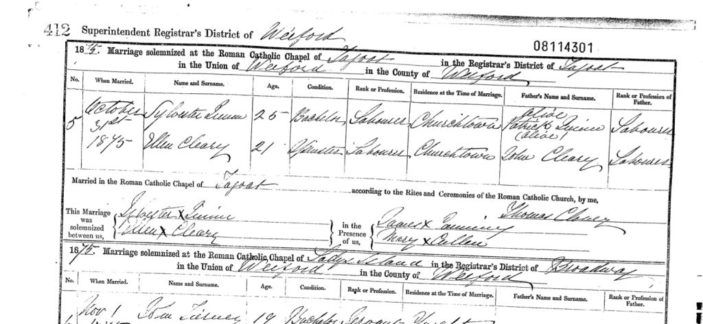 Ellen was my great-great-grandfather Patrick Cleary’s sister. I have been looking for the names of my great-great-great grandparents for a long time. According to this record, her father’s name was John Cleary, and he was alive in 1875. Ellen’s residence says Churchtown. Can I safely assume that she was living with her father in Churchtown before her marriage?