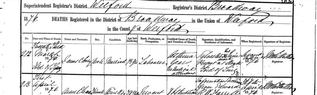 The second document is a death record for a James Cleary who died in 1876. I can’t quite make out his age. Can you? It looks like the informant says Sylvester Quinn. I can’t read what it says under his name. The bottom line says Ford of Ling. I have a baptism record for James Quinn, born 1877, the son of Ellen Cleary Quinn and Sylvester Quinn in Ford of Ling, Wexford. So I am thinking that James Cleary is Ellen’s brother or maybe an uncle depending on his age. Can you make out what the cause of death says?